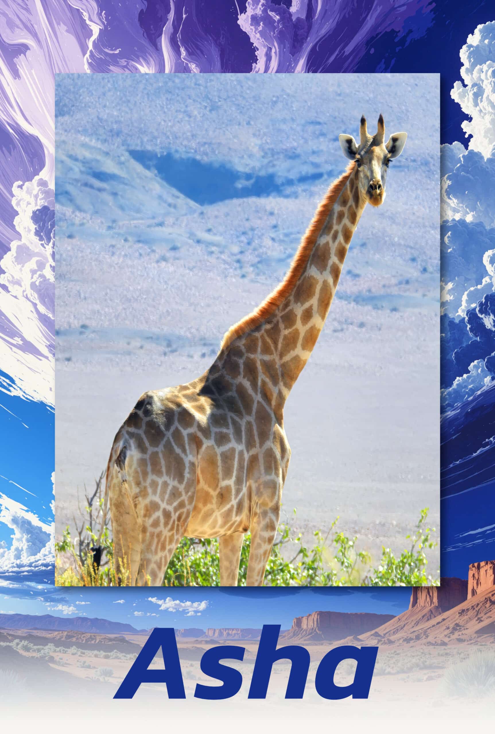 Asha (KHBF035) is an adult female desert-dwelling giraffe who likes to hang out in the Khumib River area of northwest Namibia. She is defined by her dynamic energy and pioneering spirit, approaching the landscape with confident curiosity. Asha is frequently observed covering significant distances and actively seeking new forage. She usually keeps company with a few female friends and their calves. Her active nature makes her a powerful example of the adaptability and resilience required for survival in the wild.